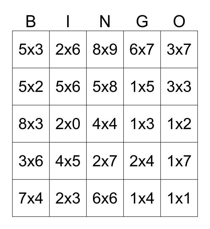 This bingo card has 25 words: 4x5, 6x6, 5x8, 7x4, 3x7, 5x3, 5x2, 2x6, 1x3, 2x7, 1x5, 8x3, 2x4, 1x7, 5x6, 1x1, 1x2, 8x9, 3x3, 2x0, 4x4, 2x3, 3x6, 6x7 and 1x4.