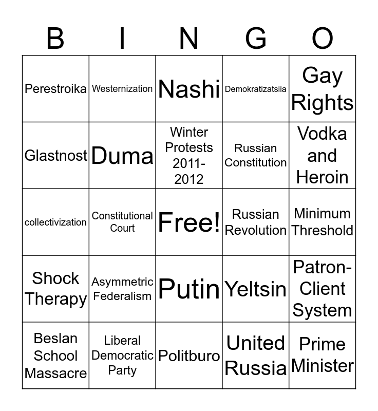 This bingo card has a free space and 24 words: Asymmetric Federalism, Liberal Democratic Party, Winter Protests 2011-2012, Beslan School Massacre, Gay Rights, Perestroika, Glastnost, Westernization, Russian Revolution, Putin, Russian Constitution, collectivization, Yeltsin, Patron-Client System, Duma, United Russia, Minimum Threshold, Nashi, Vodka and Heroin, Constitutional Court, Prime Minister, Shock Therapy, Demokratizatsiia and Politburo.