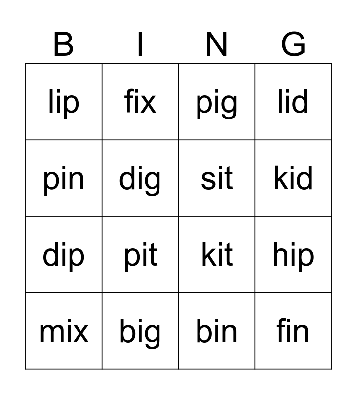 This bingo card has 16 words: big, hip, pig, lip, dip, fix, kit, bin, pin, dig, mix, lid, pit, kid, sit and fin.