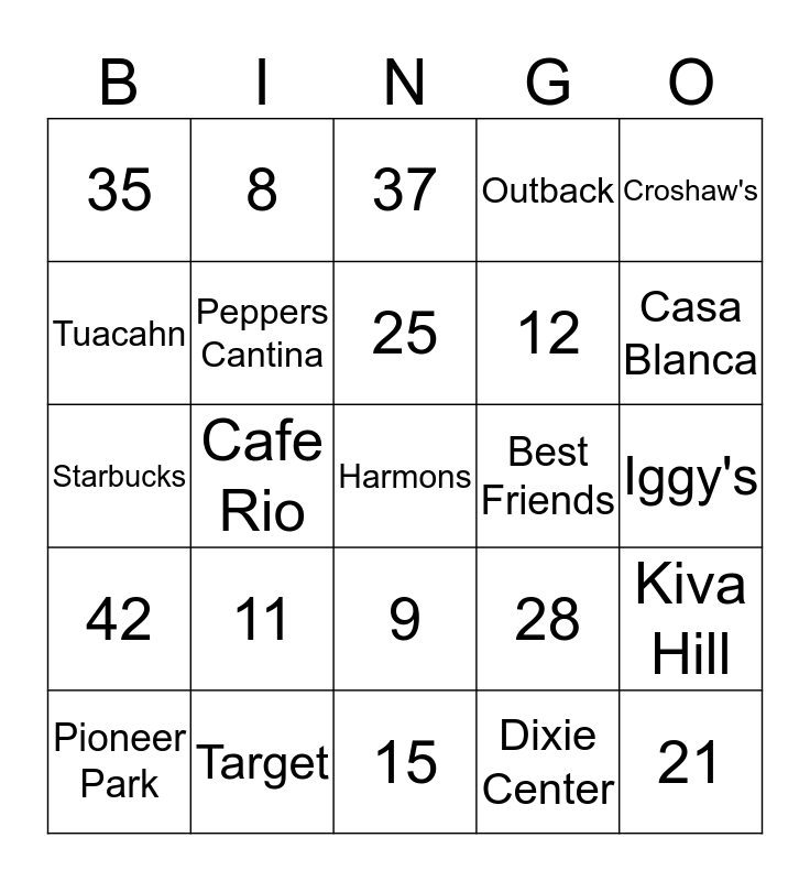 This bingo card has a free space and 24 words: 11, Target, 25, Pioneer Park, Croshaw's, 35, Tuacahn, 8, Best Friends, 9, 12, Starbucks, 28, Kiva Hill, Peppers Cantina, Dixie Center, Iggy's, 37, Casa Blanca, Cafe Rio, 21, 42, Outback and 15.