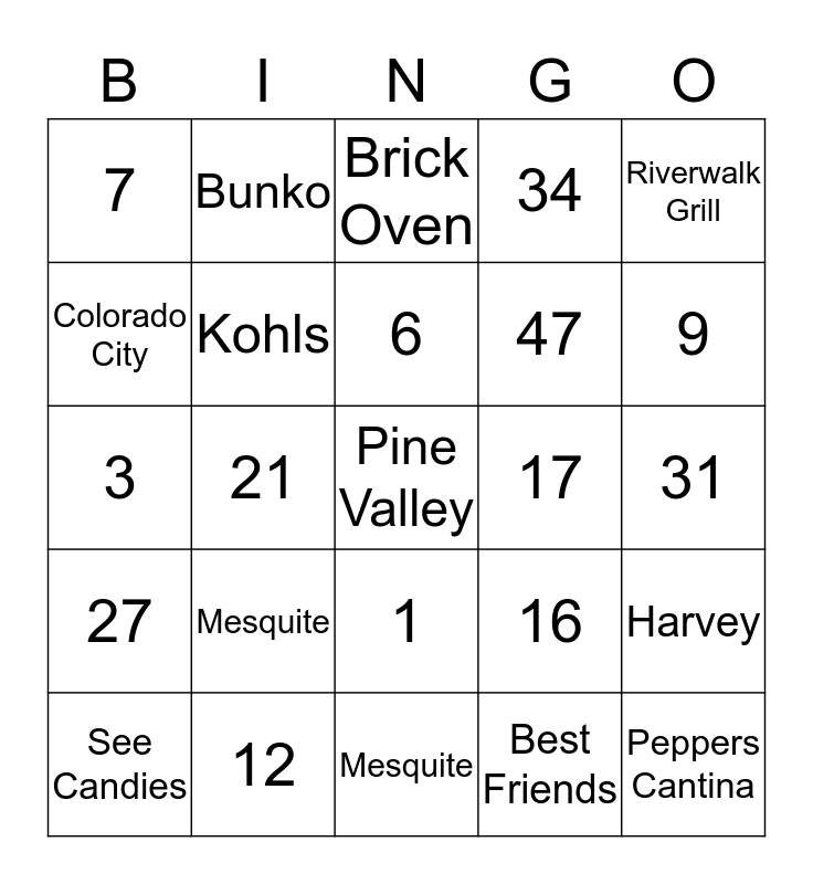 This bingo card has a free space and 24 words: Mesquite, 12, 6, See Candies, Riverwalk Grill, 7, Colorado City, Bunko, 17, 1, 47, 3, 16, Harvey, Kohls, Best Friends, 31, Brick Oven, 9, 21, Peppers Cantina, 27, 34 and Mesquite.
