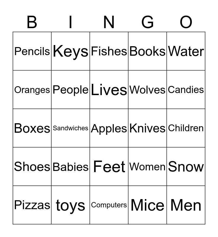 This bingo card has 25 words: Babies, Computers, Lives, Pizzas, Water, Pencils, Oranges, Keys, Knives, Feet, Wolves, Boxes, Women, Snow, People, Men, Children, Fishes, Candies, Sandwiches, Apples, toys, Shoes, Books and Mice.