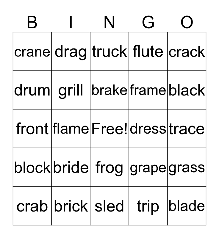 This bingo card has a free space and 24 words: bride, brick, brake, crab, crack, crane, drum, drag, dress, frog, frame, front, grape, grass, grill, trip, trace, truck, black, flame, blade, block, flute and sled.