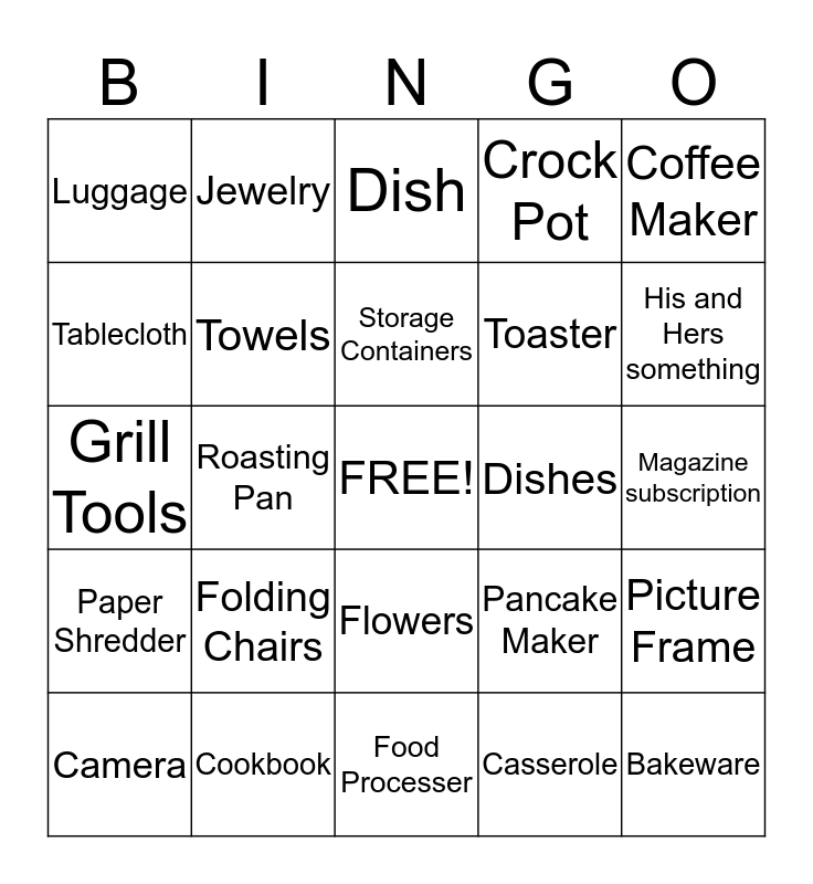 This bingo card has a free space and 45 words: Apron, Bakeware, Basting Brush/Set, Camera, Candle, Casserole, Dish, Chip Clips, Coffee Maker, Cookbook, Crock Pot, Dishes, Flowers, Folding Chairs, Folding Table, Food Processer, Gift Card, Grill Tools, Hamper, His and Hers something, Jewelry, Laundry Basket, Lingerie, Luggage, Luggage Tags, Magazine subscription, Microwave, Mixer, Pancake Maker, Paper Shredder, Personalized something, Picture Frame, Potato Masher, Pots and Pans, Rhino Statue, Roasting Pan, Safe, Salt and Pepper Shakers, Sheets, Storage Containers, Tablecloth, Toaster, Towel Bar, Towels and Waffle Maker.
