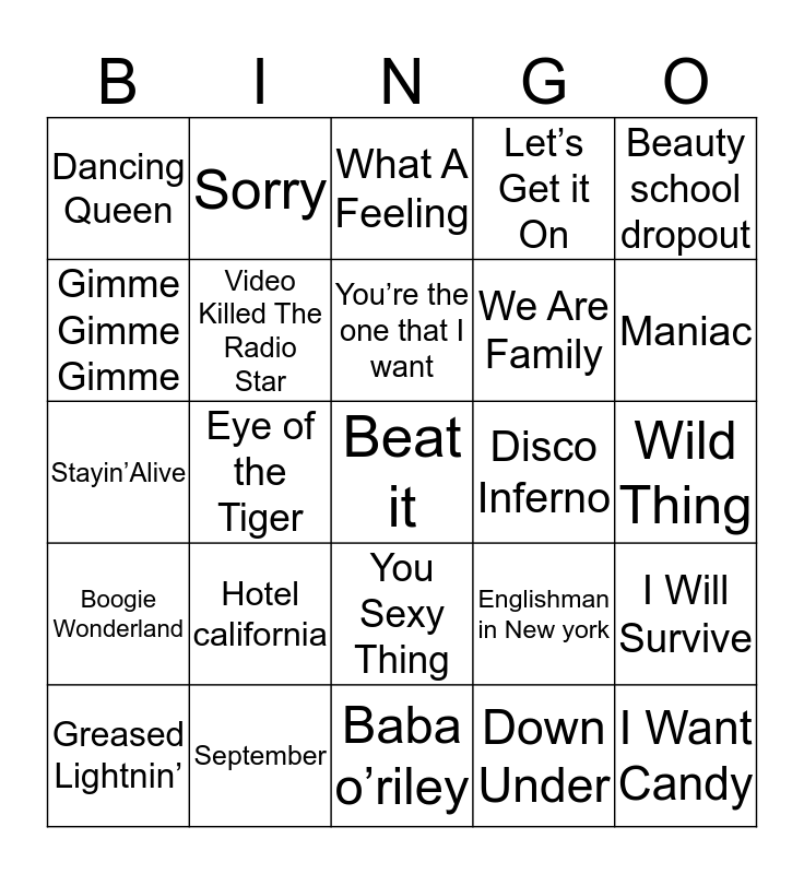 This bingo card has 25 words: Hotel california, Baba o’riley, You’re the one that I want, Greased Lightnin’, Beauty school dropout, Dancing Queen, Gimme Gimme Gimme, Sorry, Disco Inferno, You Sexy Thing, We Are Family, Stayin’Alive, Englishman in New york, I Will Survive, Video Killed The Radio Star, I Want Candy, Wild Thing, What A Feeling, Maniac, Eye of the Tiger, Beat it, September, Boogie Wonderland, Let’s Get it On and Down Under.