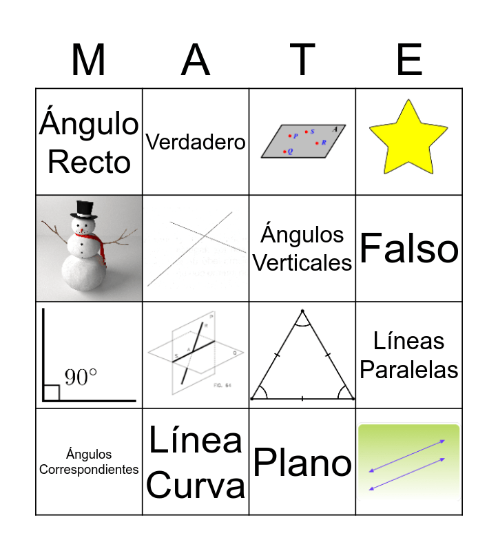 This bingo card has 8 images and 8 words: Ángulos Correspondientes, Línea Curva, Verdadero, Líneas Paralelas, Ángulo Recto, Plano, Falso and Ángulos Verticales.