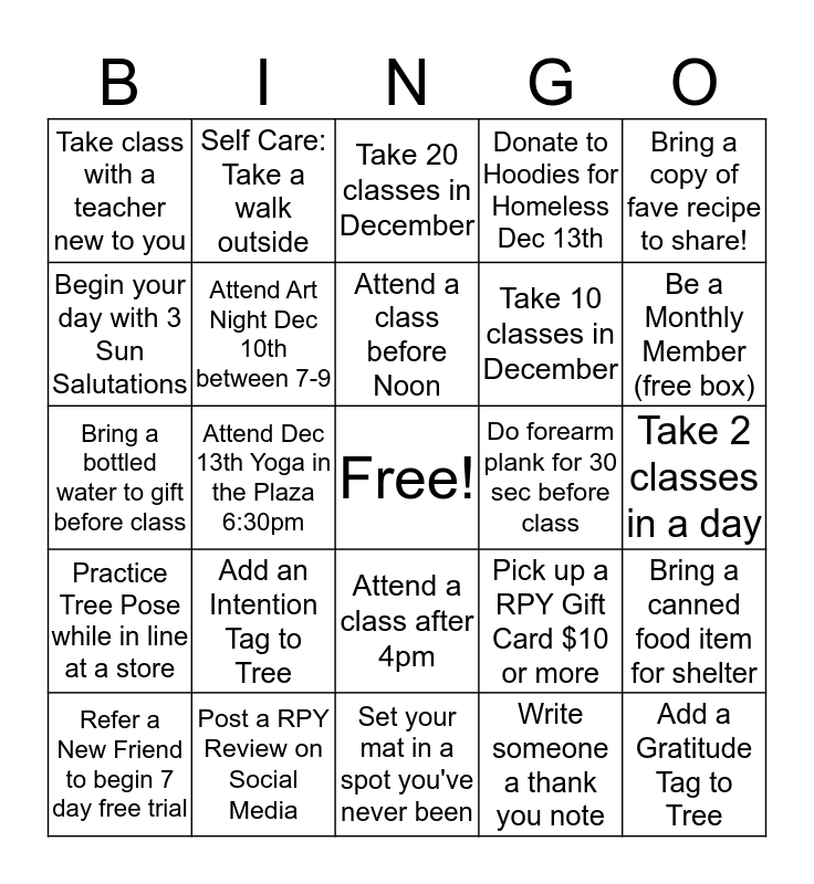 This bingo card has a free space and 24 words: Add an Intention Tag to Tree, Post a RPY Review on Social Media, Attend a class before Noon, Refer a New Friend to begin 7 day free trial, Bring a copy of fave recipe to share!, Take class with a teacher new to you, Begin your day with 3 Sun Salutations, Self Care: Take a walk outside, Do forearm plank for 30 sec before class, Attend a class after 4pm, Take 10 classes in December, Bring a bottled water to gift before class, Pick up a RPY Gift Card $10 or more, Bring a canned food item for shelter, Attend Art Night Dec 10th between 7-9, Write someone a thank you note, Take 2 classes in a day, Take 20 classes in December, Be a Monthly Member (free box), Attend Dec 13th Yoga in the Plaza 6:30pm, Add a Gratitude Tag to Tree, Practice Tree Pose while in line at a store, Donate to Hoodies for Homeless Dec 13th and Set your mat in a spot you've never been.