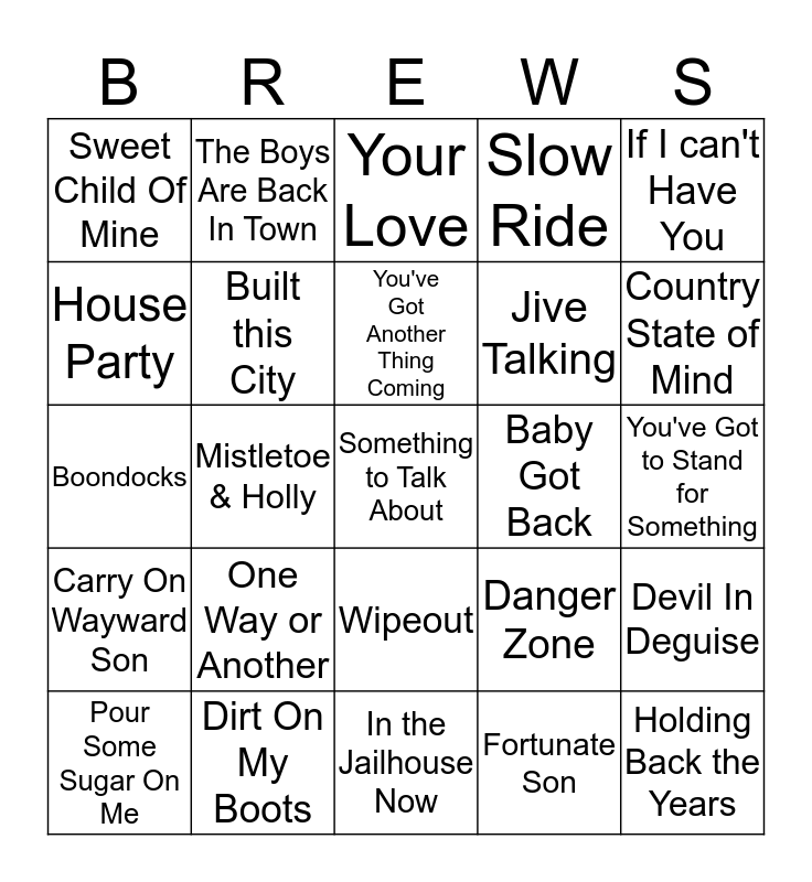 This bingo card has a free space and 24 words: One Way or Another, Dirt On My Boots, You've Got Another Thing Coming, Pour Some Sugar On Me, If I can't Have You, Sweet Child Of Mine, House Party, The Boys Are Back In Town, Baby Got Back, Wipeout, Jive Talking, Boondocks, Danger Zone, Devil In Deguise, Built this City, Fortunate Son, You've Got to Stand for Something, Your Love, Country State of Mind, Mistletoe & Holly, Holding Back the Years, Carry On Wayward Son, Slow Ride and In the Jailhouse Now.