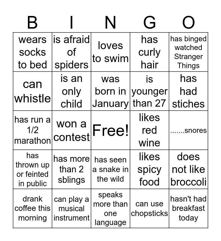 This bingo card has a free space and 24 words: has more than 2 sblings, can play a musical instrument, was born in January, drank coffee this morning, has binged watched Stranger Things, wears socks to bed, can whistle, is afraid of spiders, likes red wine, has seen a snake in the wild, is younger than 27, has run a 1/2 marathon, likes spicy food, does not like broccoli, is an only child, can use chopsticks, .......snores, loves to swim, has had stiches, won a contest, hasn't had breakfast today, has thrown up or feinted in public, has curly hair and speaks more than one language.