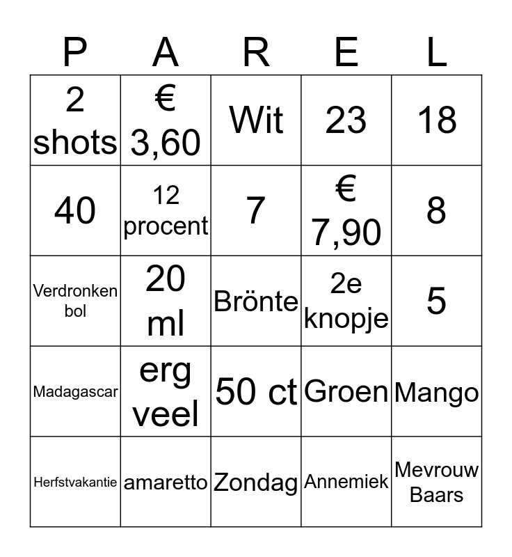 This bingo card has 69 words: 7 liter, 5, Melk, Fructose, amaretto, Elsemieke, 23, rood, 18, € 3,30, Mango, Grijs, 2 shots, Wit, Blauw en zilver, 20 ml, 50 ct, € 7,90, 5, Madagascar, 2e knopje, Groen, 8, absoluut niet, fooienpot, koningsdag, ja, 35, Annemiek, nee, € 3,60, 2, John's Fruit, 100 cc, 20-25 sec, Yoghurt-Bosvruchten, Handen wassen, zwart, 40, Mevrouw Baars, erg veel, Brönte, € 3,50, Vitrine schoonmaken, 2e, Herfstvakantie, 12, Desinfecteren, 200, 12 procent, 7, Esmé, Corine, Zondag, 4, Janita, Paula, Iris, Suzanne, Verdronken bol, Smakelijck, Stefan, zilver, 3, Willianne, Marije, Marit, Lianne and Pieter.