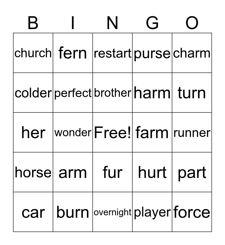 This bingo card has a free space and 24 words: arm, burn, brother, car, charm, church, colder, fern, farm, fur, harm, her, hurt, part, perfect, player, runner, restart, turn, wonder, force, horse, purse and overnight.