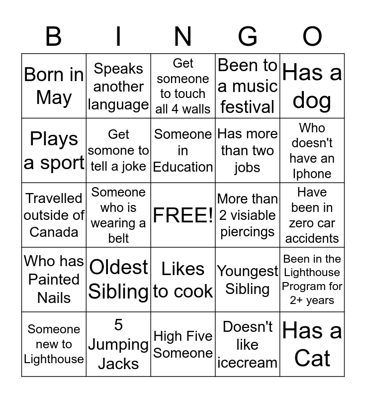 This bingo card has a free space and 24 words: Oldest Sibling, 5 Jumping Jacks, Someone in Education, Someone new to Lighthouse, Has a dog, Born in May, Plays a sport, Speaks another language, More than 2 visiable piercings, Likes to cook, Has more than two jobs, Travelled outside of Canada, Youngest Sibling, Been in the Lighthouse Program for 2+ years, Get somone to tell a joke, Doesn't like icecream, Have been in zero car accidents, Get someone to touch all 4 walls, Who doesn't have an Iphone, Someone who is wearing a belt, Has a Cat, Who has Painted Nails, Been to a music festival and High Five Someone.