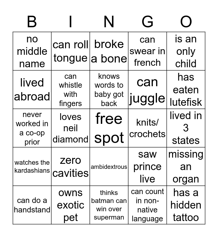 This bingo card has a free space and 24 words: zero cavities, owns exotic pet, knows words to baby got back, can do a handstand, is an only child, no middle name, lived abroad, can roll tongue, knits/ crochets, ambidextrous, can juggle, never worked in a co-op prior, saw prince live, missing an organ, can whistle with fingers, can count in non-native language, lived in 3 states, broke a bone, has eaten lutefisk, loves neil diamond, has a hidden tattoo, watches the kardashians, can swear in french and thinks batman can win over superman.