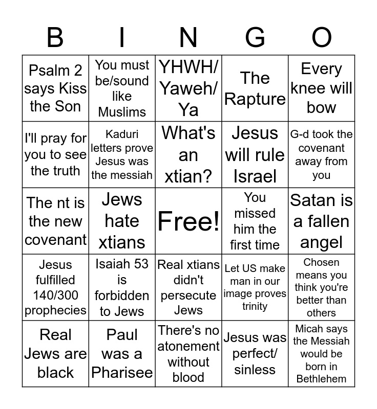This bingo card has a free space and 24 words: Isaiah 53 is forbidden to Jews, Paul was a Pharisee, What's an xtian?, Real Jews are black, Every knee will bow, Psalm 2 says Kiss the Son, I'll pray for you to see the truth, You must be/sound like Muslims, You missed him the first time, Real xtians didn't persecute Jews, Jesus will rule Israel, The nt is the new covenant, Let US make man in our image proves trinity, Chosen means you think you're better than others, Kaduri letters prove Jesus was the messiah, Jesus was perfect/ sinless, Satan is a fallen angel, YHWH/ Yaweh/ Ya, G-d took the covenant away from you, Jews hate xtians, Micah says the Messiah would be born in Bethlehem, Jesus fulfilled 140/300 prophecies, The Rapture and There's no atonement without blood.