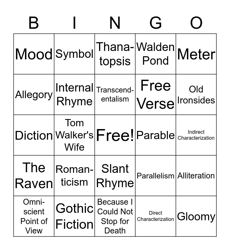 This bingo card has a free space and 24 words: Roman-ticism, Gothic Fiction, Transcend-entalism, Omni- scient Point of View, Meter, Mood, Allegory, Symbol, Parable, Slant Rhyme, Free Verse, Diction, Parallelism, Alliteration, Internal Rhyme, Direct Characterization, Indirect Characterization, Thana- topsis, Old Ironsides, Tom Walker's Wife, Gloomy, The Raven, Walden Pond and Because I Could Not Stop for Death.