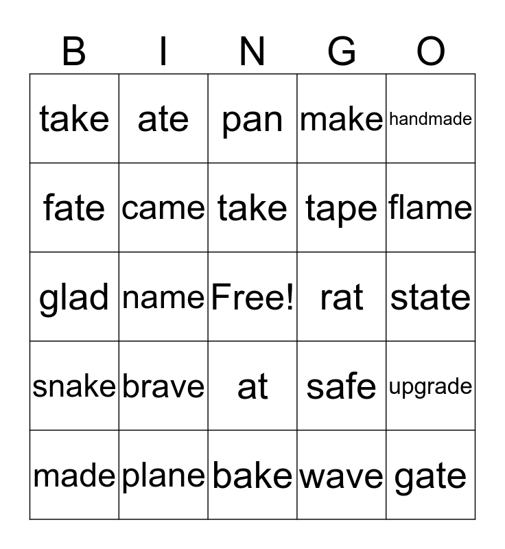 This bingo card has a free space and 57 words: rake, made, gave, take, bake, fad, came, mad, tape, tap, make, sale, cape, wake, late, pancake, handmade, name, same, gate, rat, rate, safe, pan, late, take, pan, pane, flame, can, mistake, fade, classmate, dictate, state, fate, brake, glad, clap, snake, ate, at, fat, whale, lame, slap, brave, plane, plan, shape, grape, wave, exhale, statement, demonstrate, upgrade and man.