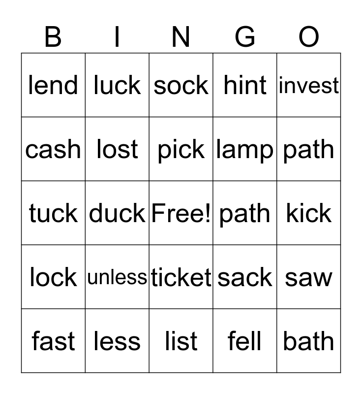 This bingo card has a free space and 56 words: rust, fast, bump, lend, list, rest, lost, mend, lamp, hand, hint, ask, insist, absent, down, went, invest, duck, dock, bath, path, deck, sack, sock, lick, pick, polish, bucket, path, back, hush, wish, with, bath, kick, cash, tuck, rush, lock, luck, ticket, backpack, punish, sunlit, sadness, unless, less, loss, mess, fuss, fell, boss, fill, children, saw and said.