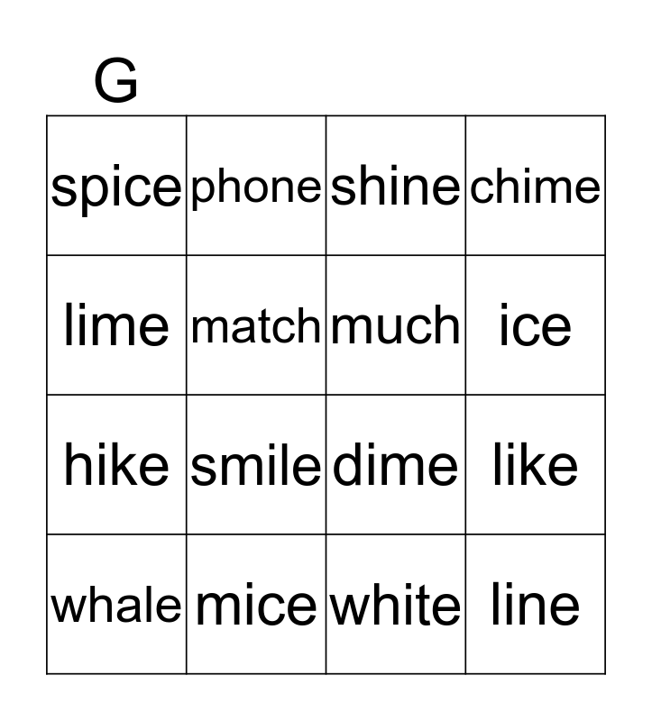 This bingo card has 16 words: mice, like, shine, spice, hike, phone, dime, white, lime, match, whale, chime, smile, ice, much and line.
