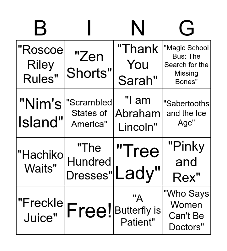 This bingo card has 21 words: Free!, "Diary of a Worm", "Zen Shorts", "Leave Me Alone", "A Butterfly is Patient", "I am Abraham Lincoln", "Roscoe Riley Rules", "Thank You Sarah", "Tree Lady", "Sabertooths and the Ice Age", "Hachiko Waits", "Magic School Bus: The Search for the Missing Bones", "Who Says Women Can't Be Doctors", "The Man Who Walked Between the Towers", "Scrambled States of America", "Why Mosquitos Buzz in People's Ears", "Freckle Juice", "The Hundred Dresses", "Nim's Island", "Pinky and Rex" and "The World According to Humphrey".