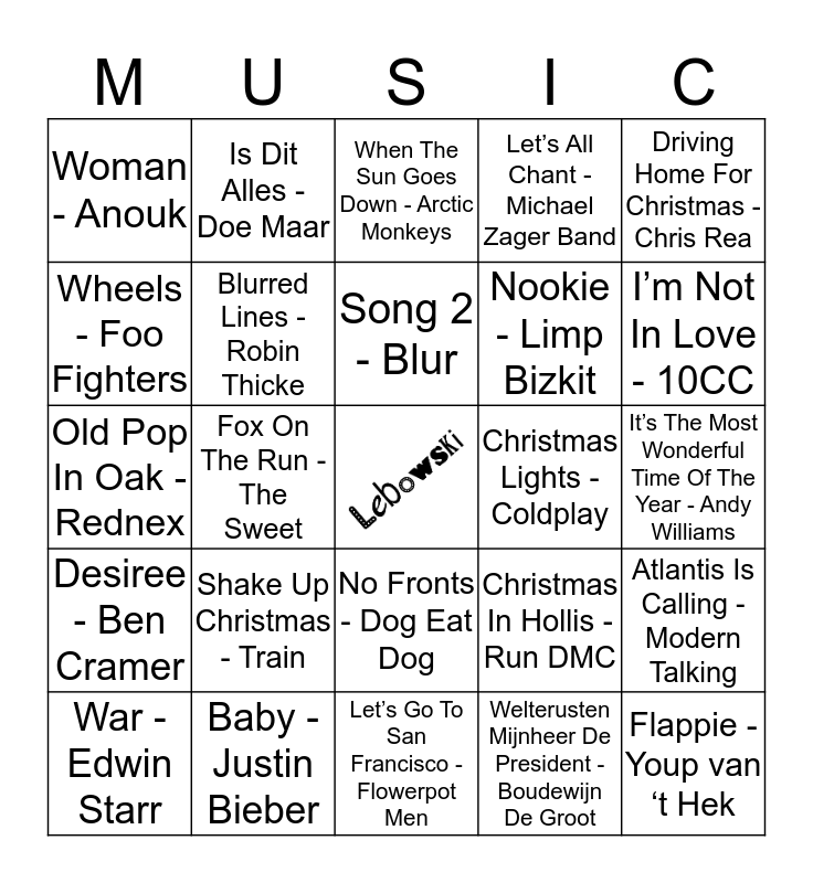 This bingo card has a free space and 24 words: Shake Up Christmas - Train, Baby - Justin Bieber, Song 2 - Blur, War - Edwin Starr, Driving Home For Christmas - Chris Rea, Woman - Anouk, Wheels - Foo Fighters, Is Dit Alles - Doe Maar, Christmas Lights - Coldplay, No Fronts - Dog Eat Dog, Nookie - Limp Bizkit, Old Pop In Oak - Rednex, Christmas In Hollis - Run DMC, Atlantis Is Calling - Modern Talking, Blurred Lines - Robin Thicke, Welterusten Mijnheer De President - Boudewijn De Groot, It’s The Most Wonderful Time Of The Year - Andy Williams, When The Sun Goes Down - Arctic Monkeys, I’m Not In Love - 10CC, Fox On The Run - The Sweet, Flappie - Youp van ‘t Hek, Desiree - Ben Cramer, Let’s All Chant - Michael Zager Band and Let’s Go To San Francisco - Flowerpot Men.