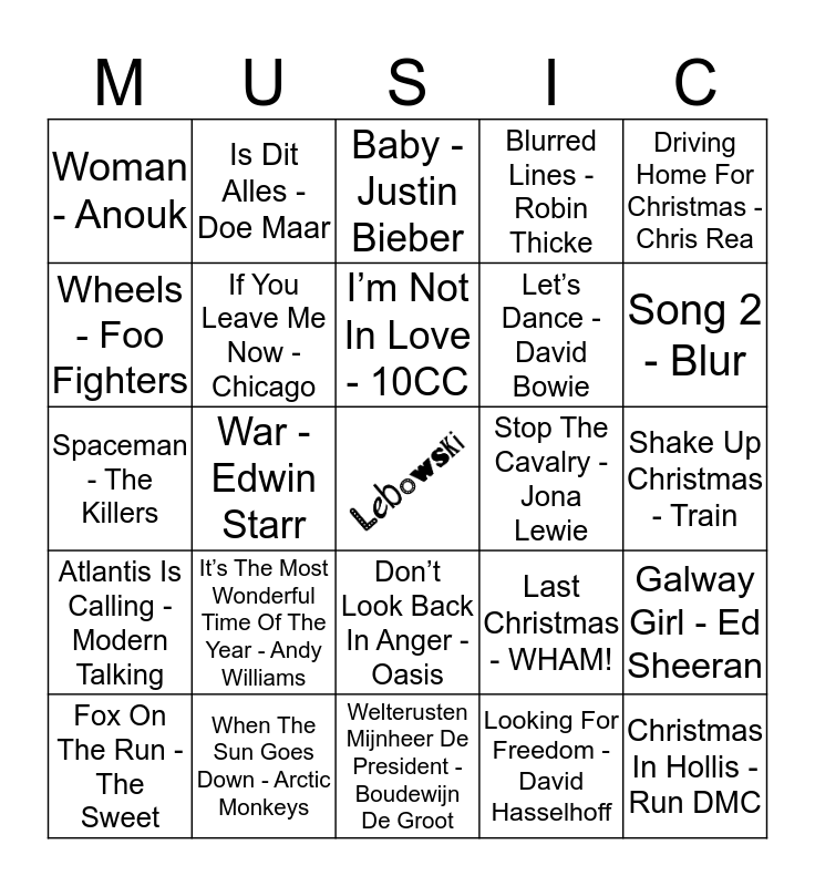 This bingo card has a free space and 24 words: It’s The Most Wonderful Time Of The Year - Andy Williams, When The Sun Goes Down - Arctic Monkeys, I’m Not In Love - 10CC, Fox On The Run - The Sweet, Driving Home For Christmas - Chris Rea, Woman - Anouk, Wheels - Foo Fighters, Is Dit Alles - Doe Maar, Stop The Cavalry - Jona Lewie, Don’t Look Back In Anger - Oasis, Let’s Dance - David Bowie, Spaceman - The Killers, Last Christmas - WHAM!, Galway Girl - Ed Sheeran, If You Leave Me Now - Chicago, Looking For Freedom - David Hasselhoff, Shake Up Christmas - Train, Baby - Justin Bieber, Song 2 - Blur, War - Edwin Starr, Christmas In Hollis - Run DMC, Atlantis Is Calling - Modern Talking, Blurred Lines - Robin Thicke and Welterusten Mijnheer De President - Boudewijn De Groot.
