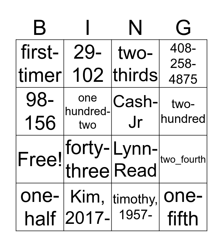 This bingo card has 25 words: one-fourth, fifth-one, Lynn-Read, Wal-Mart, first-timer, 29-102, two-thirds, 408-258-4875, Free!, forty-three, timothy, 1957-, two_fourth, ant-tony, Kim, 2017-, Cash-Jr, 831-525-1474, one-half, one hundred-two, 4-5=1, one-fifth, 98-156, Tee-Dan, Free!, two-hundred and two-fourths.