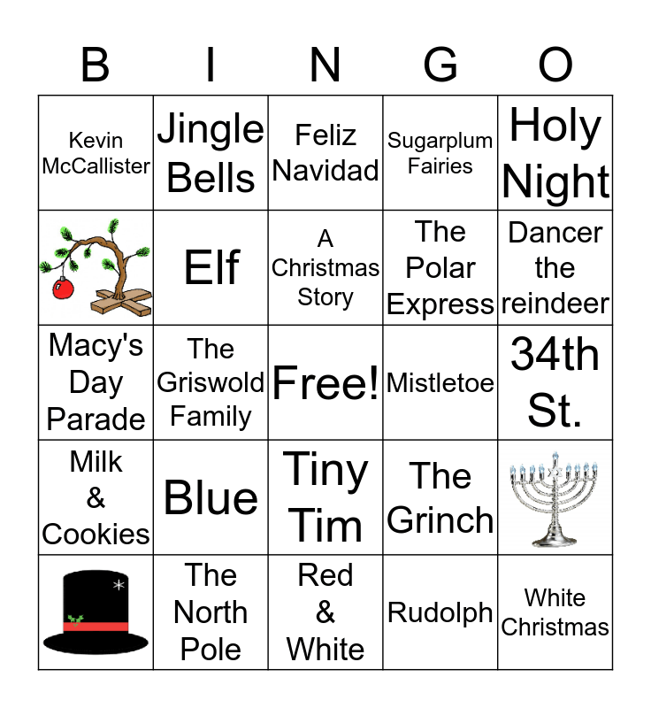 This bingo card has 3 images, a free space and 21 words: Blue, The North Pole, A Christmas Story, Holy Night, Kevin McCallister, Jingle Bells, Mistletoe, Tiny Tim, The Polar Express, Macy's Day Parade, The Grinch, Elf, Rudolph, 34th St., Feliz Navidad, Dancer the reindeer, The Griswold Family, White Christmas, Milk & Cookies, Sugarplum Fairies and Red & White.