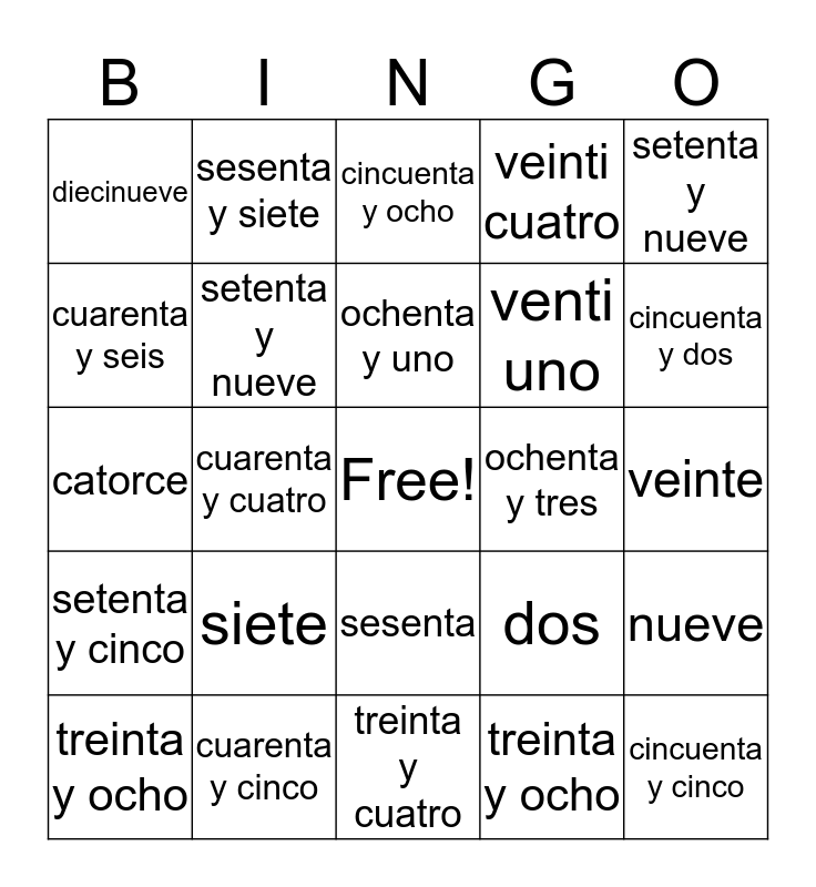 This bingo card has a free space and 27 words: dos, dieciocho, venti uno, treinta y cuatro, cuarenta y seis, cincuenta y ocho, sesenta y siete, setenta y cinco, ochenta y tres, nueve, catorce, veinti cuatro, treinta y ocho, cuarenta y cinco, cincuenta y dos, sesenta y cuatro, setenta y nueve, ochenta y uno, siete, diecinueve, veinte, treinta y ocho, cuarenta y cuatro, cincuenta y cinco, sesenta, setenta y nueve and ochenta y dos.