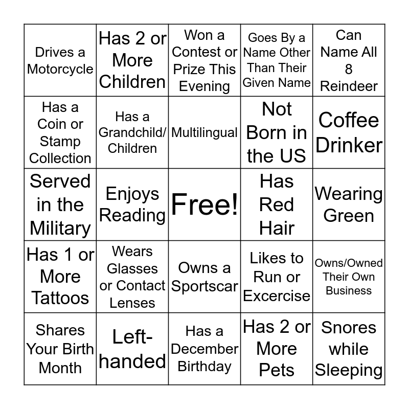 This bingo card has a free space and 24 words: Wears Glasses or Contact Lenses, Left-handed, Multilingual, Shares Your Birth Month, Can Name All 8 Reindeer, Drives a Motorcycle, Has a Coin or Stamp Collection, Has 2 or More Children, Has Red Hair, Owns a Sportscar, Not Born in the US, Served in the Military, Likes to Run or Excercise, Owns/Owned Their Own Business, Has a Grandchild/ Children, Has 2 or More Pets, Wearing Green, Won a Contest or Prize This Evening, Coffee Drinker, Enjoys Reading, Snores while Sleeping, Has 1 or More Tattoos, Goes By a Name Other Than Their Given Name and Has a December Birthday.