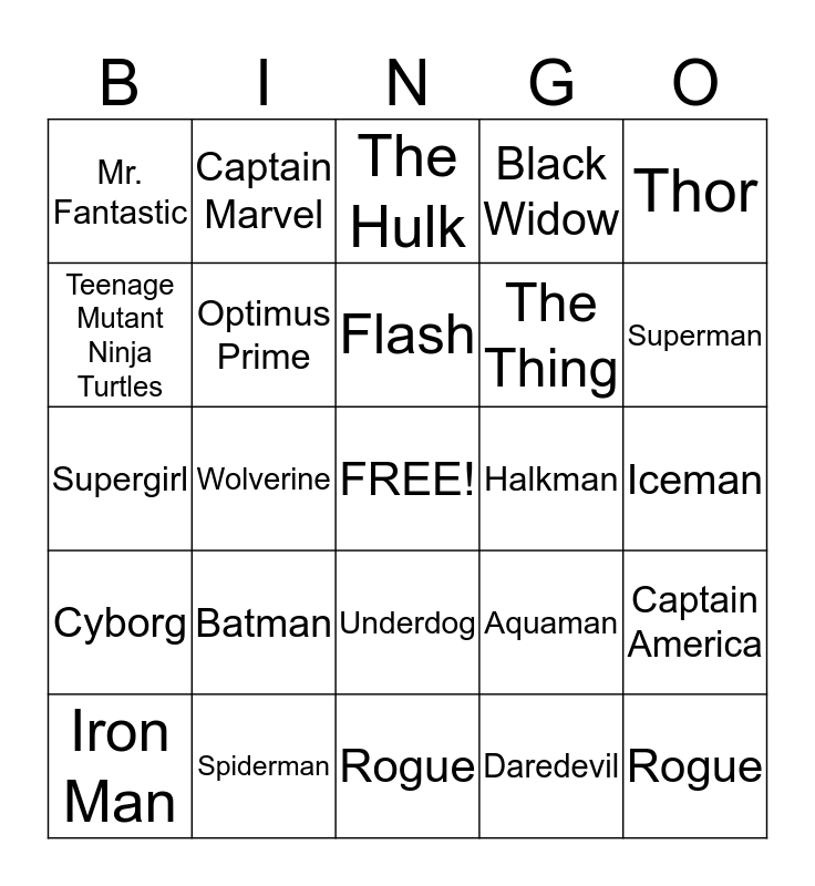 This bingo card has a free space and 24 words: Batman, Spiderman, Flash, Iron Man, Thor, Mr. Fantastic, Teenage Mutant Ninja Turtles, Captain Marvel, Halkman, Underdog, The Thing, Supergirl, Aquaman, Captain America, Optimus Prime, Daredevil, Iceman, The Hulk, Superman, Wolverine, Rogue, Cyborg, Black Widow and Rogue.
