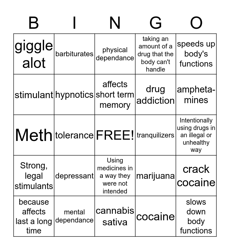 This bingo card has a free space and 24 words: depressant, mental dependance, affects short term memory, because affects last a long time, speeds up body's functions, giggle alot, stimulant, barbiturates, tranquilizers, Using medicines in a way they were not intended, drug addiction, Meth, marijuana, crack cocaine, hypnotics, cocaine, Intentionally using drugs in an illegal or unhealthy way, physical dependance, ampheta-mines, tolerance, slows down body functions, Strong, legal stimulants, taking an amount of a drug that the body can't handle and cannabis sativa.