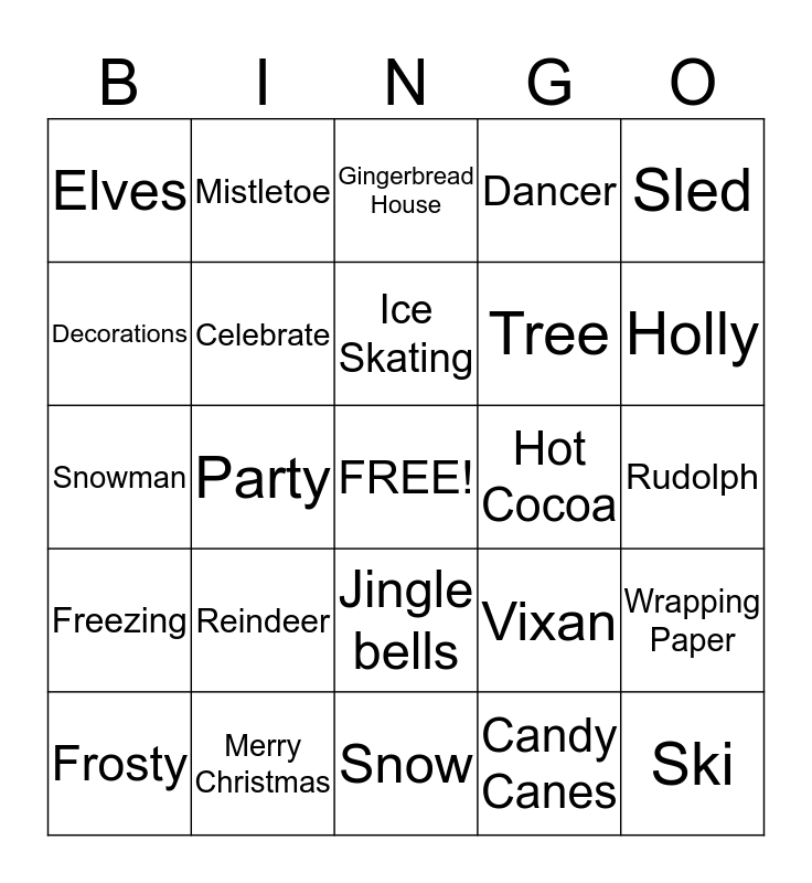 This bingo card has a free space and 59 words: Angels, Merry Christmas, Blitzer, Freezing, Candy Canes, Earmuffs, Celebrate, Chimney, Tree, Cold, Dancer, Dasher, Decorations, Scarf, Donner, Elves, Ski, Sled, Mittens, Ice Skating, Hot Cocoa, Gingerbread House, Frosty, Wrapping Paper, Gifts, Greetings, Garland, Holiday, Holly, Icicles, Dreidel, Jolly, Lights, Peace, Mistletoe, Mrs. Claus, North Pole, Party, Prancer, Snowman, Grinch, Reindeer, Rudolph, Santa Claus, Scrooge, Hannukkah, Shopping, Sleigh, Jingle bells, Snow, Star, Stockings, Tinsel, Toys, Winter, Vixan, Wreath, Mele Kalikimaka and Feliz Navidad.