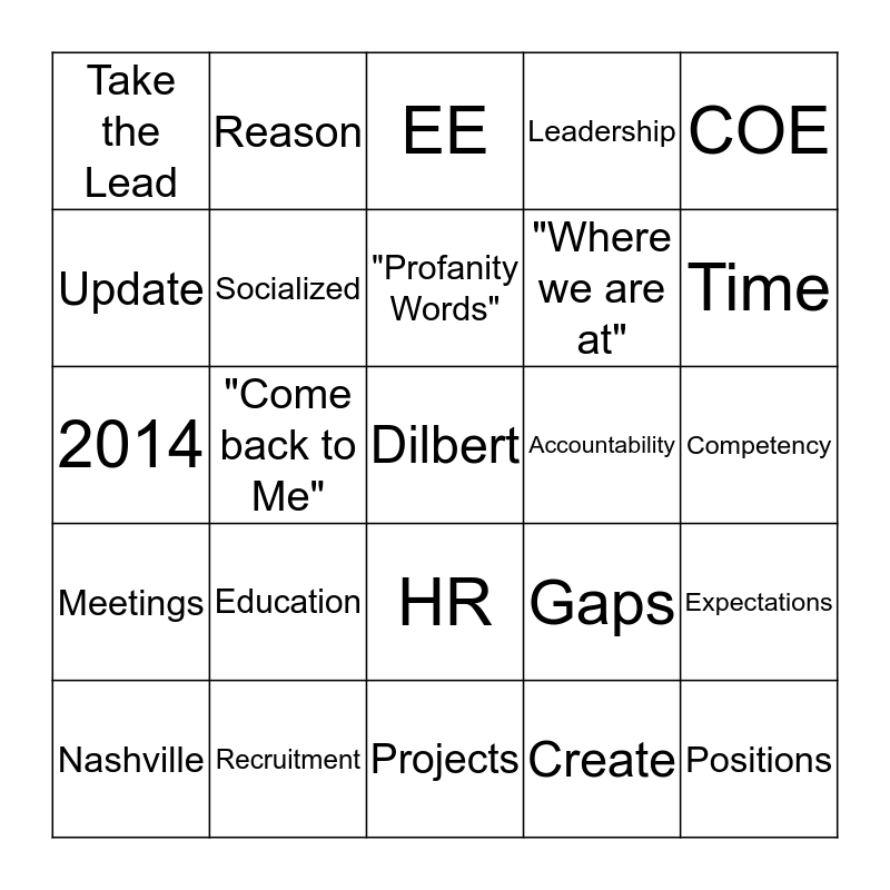 This bingo card has a free space and 24 words: Education, Recruitment, "Profanity Words", Nashville, COE, Take the Lead, Update, Reason, Accountability, HR, "Where we are at", 2014, Gaps, Expectations, Socialized, Create, Competency, EE, Time, "Come back to Me", Positions, Meetings, Leadership and Projects.