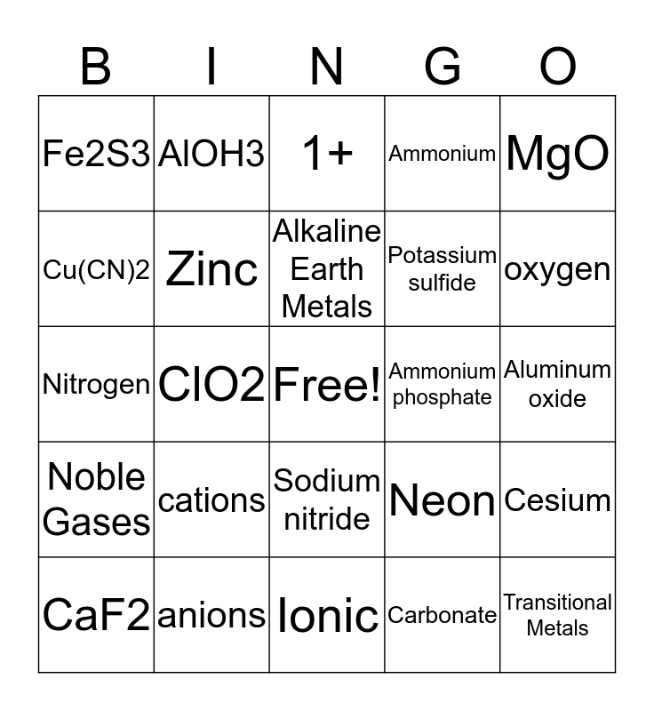 This bingo card has a free space and 24 words: cations, anions, Alkaline Earth Metals, CaF2, MgO, Fe2S3, Cu(CN)2, AlOH3, Ammonium phosphate, Sodium nitride, Potassium sulfide, Nitrogen, Neon, Cesium, Zinc, Carbonate, Aluminum oxide, 1+, oxygen, ClO2, Transitional Metals, Noble Gases, Ammonium and Ionic.