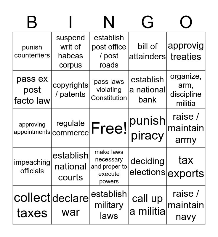 This bingo card has a free space and 29 words: collect taxes, borrow money, regulate commerce, establish rules for citizenship, punish counterfiers, establish post office / post roads, copyrights / patents, establish national courts, punish piracy, declare war, raise / maintain army, raise / maintain navy, establish military laws, call up a militia, organize, arm, discipline militia, govern D.C., make laws necessary and proper to execute powers, impeaching officials, approvig treaties, approving appointments, deciding elections, establish military academies, establish a national bank, pass ex post facto law, bill of attainders, suspend writ of habeas corpus, tax exports, pass laws violating Constitution and grant titles of nobility.