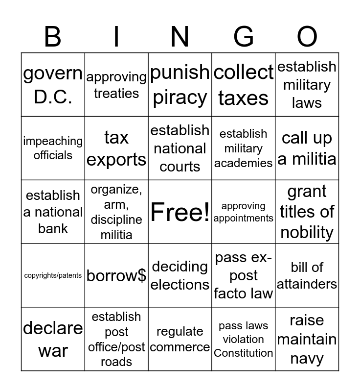 This bingo card has a free space and 24 words: borrow$, establish post office/post roads, establish national courts, declare war, establish military laws, govern D.C., impeaching officials, approving treaties, approving appointments, deciding elections, establish military academies, establish a national bank, pass ex-post facto law, bill of attainders, tax exports, pass laws violation Constitution, grant titles of nobility, punish piracy, call up a militia, organize, arm, discipline militia, raise maintain navy, copyrights/patents, collect taxes and regulate commerce.