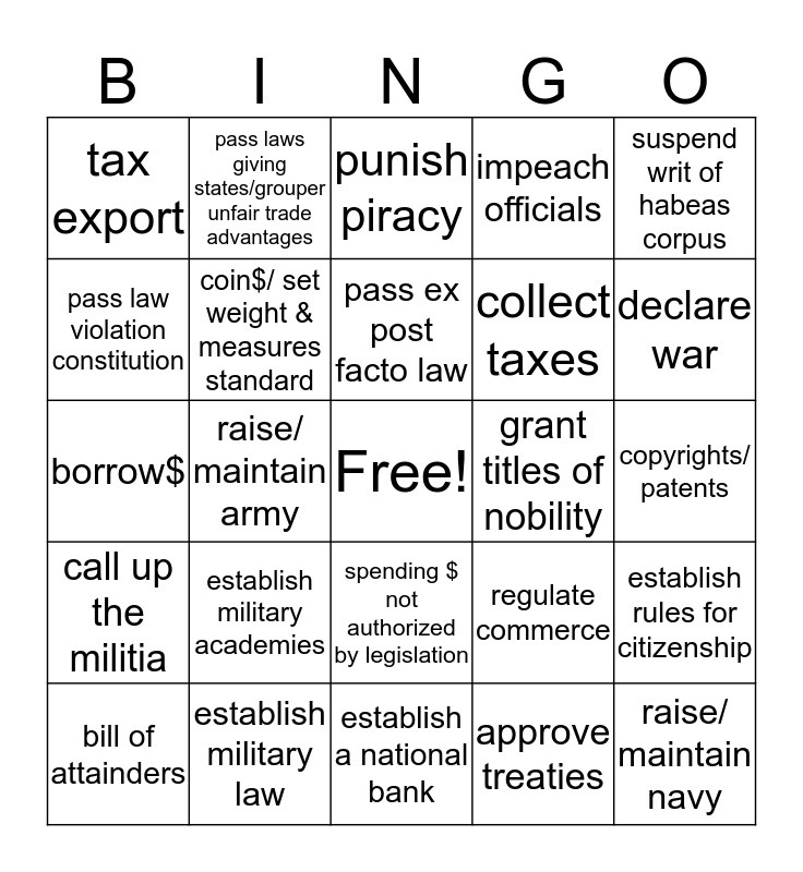 This bingo card has a free space and 25 words: establish military academies, establish a national bank, pass ex post facto law, bill of attainders, suspend writ of habeas corpus, tax export, pass law violation constitution, pass laws giving states/grouper unfair trade advantages, grant titles of nobility, spending $ not authorized by legislation, collect taxes, borrow$, regulate commerce, establish rules for citizenship, coin$/ set weight & measures standard, punish counterfeiters, copyrights/ patents, punish piracy, declare war, raise/ maintain army, raise/ maintain navy, establish military law, call up the militia, impeach officials and approve treaties.