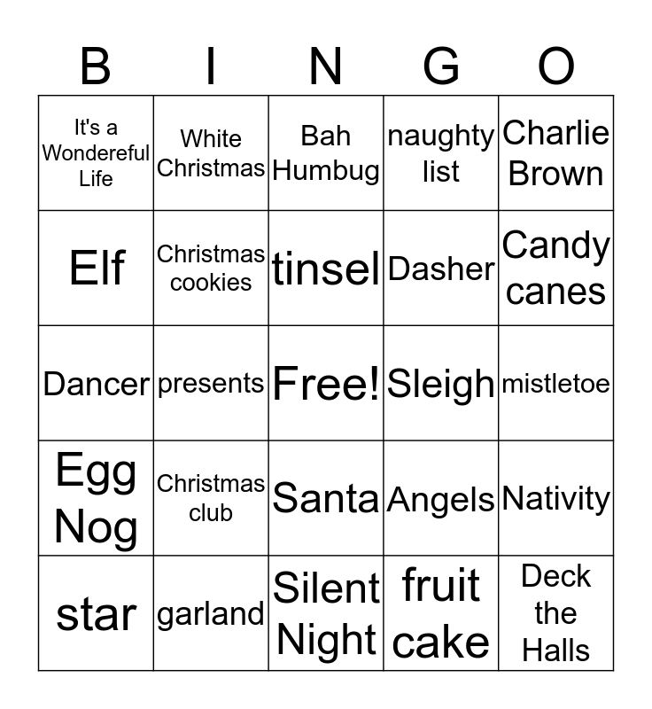 This bingo card has a free space and 24 words: Christmas club, garland, tinsel, star, Charlie Brown, It's a Wondereful Life, Elf, White Christmas, Sleigh, Santa, Dasher, Dancer, Angels, Nativity, Christmas cookies, fruit cake, mistletoe, Bah Humbug, Candy canes, presents, Deck the Halls, Egg Nog, naughty list and Silent Night.