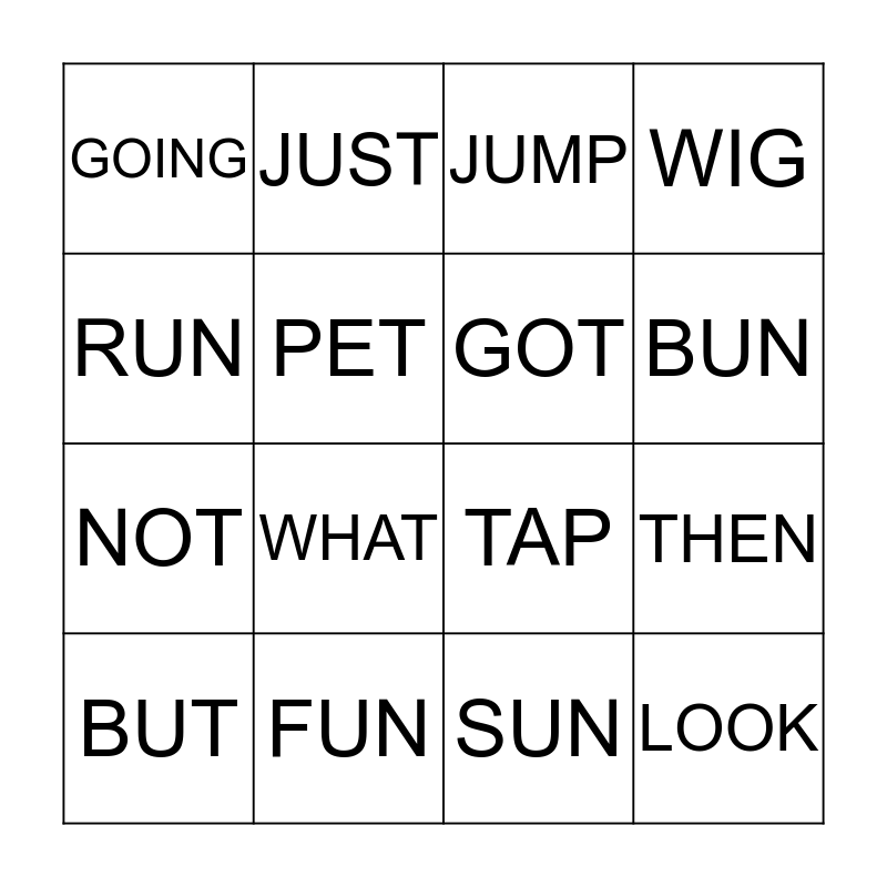 This bingo card has 16 words: FUN, THEN, JUMP, GOING, NOT, JUST, TAP, SUN, RUN, PET, BUT, WIG, WHAT, BUN, GOT and LOOK.