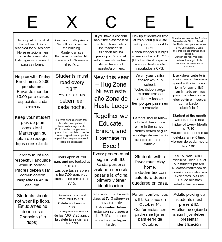 This bingo card has a free space and 24 words: Doors open at 7:00 a.m. and are locked at 7:45 a.m. Las puertas se abren a las 7:00 a.m. y se cierran con llave a las 7:45., Breakfast is served from 7:00 to 7:20. Cafeteria closes at 7:30. El desayuno es servido de las 7:00- 7:20 a.m. y la cafetería se cierra a las 7:30, New this year – Hug Zone Nuevo este año Zona de Hasta Luego, Students should not wear flip flops. Estudiantes no deben usar Chanclas (flip flops)., Nuestra escuela recibe fondos federales de Titulo I. Fondos del Titulo I son para servicios a los estudiantes o para mejorar los programas en la escuela. Our school receives Title I federal funding to help improve our services to students., Do not park in front of the school. This is reserved for buses only. No se estacionen en frente de la escuela. Este lugar es reservado para camiones., Help us with Friday Enrichment. $5.00 per student. Favor de mandar $5.00 para clases especiales cada viernes., Keep your calls private. No cell phone use in the building. Mantengan sus llamadas privadas. No usen sus teléfonos en el edificio., Parents should follow student dress code while in the school. Padres deben seguir el código de vestuario cuando están en el edificio., Every person must sign in with ID. Cada persona visitando necesita pasar a la oficina primero y tener identificacion., Wear your visitor sticker while in school. Todos deben pegar el adhesivo de visitante todo el tiempo que pasen en la escuela., Keep your student pick up plan consistent. Mantengan su plan de recoger hijos consistente., Students with a fever must stay home. Estudiantes con calentura deben quedarse en casa., Our STAAR data is excellent! Over 90% of our students passed. Nuestros resultados de examines estatales son excelentes. Mas de 90% de nuestros estudiantes pasaron., Students must read every night. Estudiantes deben leer cada noche., Parent conferences will take place on October 14. Conferencias con padres se fijaran para el 14 de Octubre., Student of the month will take place last Friday of Every Month at 7:30. Estudiantes del mes se celebraran el último viernes de cada mes a las 7:30., If you have a concern about the classroom or teacher, please talk to the teacher first. Si tienen alguna preocupación con el salón o maestro/a favor de hablar con el maestro/a primero., Blackshear website is coming soon. Have you signed a Media release form for your child? Han firmado permiso para que fotos de sus hijos estén en nuestra comunicación electrónica?, Parents should ensure that their child completes all homework assignments. Padres deben asegurarse de que su hijo complete todas las tareas asignadas y proyectos especiales y vaya a la escuela cada día preparado., Adults picking up students must present ID. Adultos recogiendo a sus hijos deben presentar identificación., Parents must use respectful language while in school. Padres deben usar comunicación respetuosa en la escuela., Pick up students on time at 2:45. 2:00 (PK) Late pick ups are reported to CPS. Deben recoger sus hijos a tiempo a las 2:45. 2:00 (PK) Estudiantes que se recogen tarde serán reportados a CPS. and Students must be with class at 7:45 otherwise they are tardy. Estudiantes deben estar con su clases a las 7:45 a.m. o son marcados que llegaron tarde..