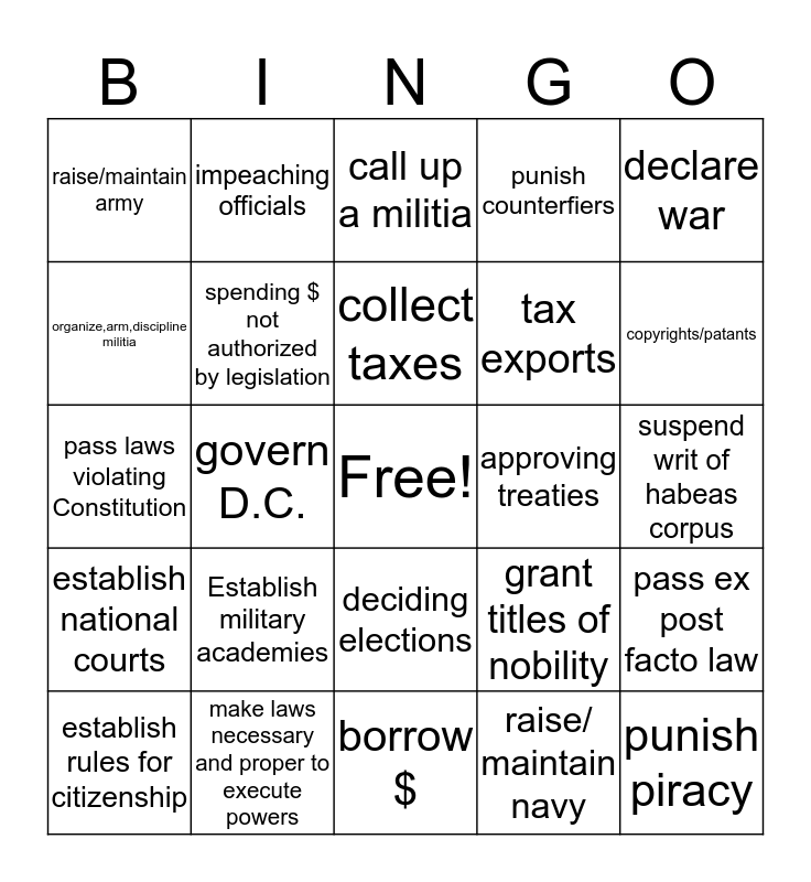 This bingo card has a free space and 25 words: Establish military academies, borrow $, collect taxes, establish rules for citizenship, declare war, raise/maintain army, organize,arm,discipline militia, impeaching officials, approving treaties, deciding elections, tax exports, pass laws violating Constitution, grant titles of nobility, pass ex post facto law, spending $ not authorized by legislation, establish a national banks, suspend writ of habeas corpus, call up a militia, copyrights/patants, govern D.C., punish piracy, make laws necessary and proper to execute powers, establish national courts, punish counterfiers and raise/ maintain navy.