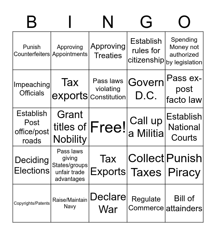 This bingo card has a free space and 27 words: Collect Taxes, Borrow Money, Govern D.C., Declare War, Impeaching Officials, Approving Treaties, Approving Appointments, Deciding Elections, Call up a Militia, Punish Piracy, Establish Post office/post roads, Establish rules for citizenship, Copyrights/Patents, Raise/Maintain Navy, Pass ex-post facto law, Pass laws violating constitution, Tax exports, Pass laws violating Constitution, Pass laws giving States/groups unfair trade advantages, Punish Counterfeiters, Establish National Courts, Regulate Commerce, Grant titles of Nobility, Bill of attainders, Tax Exports, Spending Money not authorized by legislation and Pass laws violating constitution.