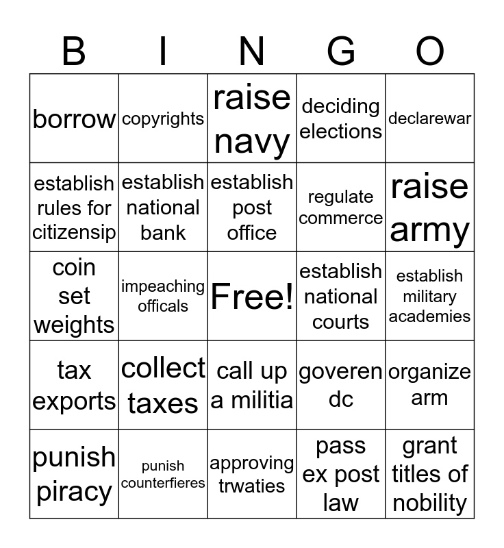 This bingo card has a free space and 24 words: collect taxes, punish counterfieres, establish post office, punish piracy, declarewar, borrow, establish rules for citizensip, copyrights, establish national courts, call up a militia, regulate commerce, coin set weights, goveren dc, organize arm, establish national bank, pass ex post law, establish military academies, raise navy, raise army, impeaching officals, grant titles of nobility, tax exports, deciding elections and approving trwaties.