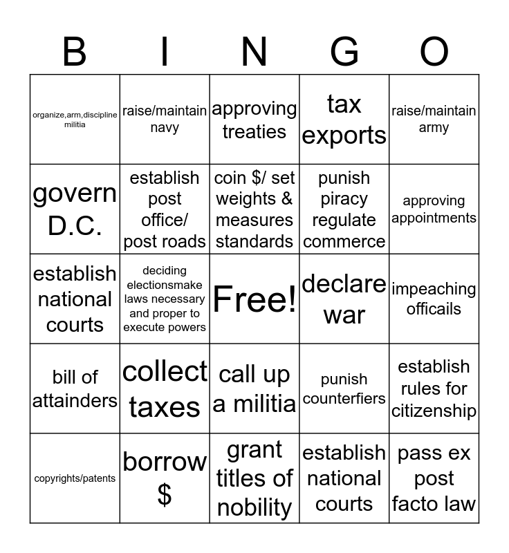 This bingo card has a free space and 24 words: collect taxes, borrow $, coin $/ set weights & measures standards, copyrights/patents, raise/maintain army, organize,arm,discipline militia, govern D.C., raise/maintain navy, declare war, call up a militia, punish piracy regulate commerce, establish national courts, punish counterfiers, establish rules for citizenship, establish post office/ post roads, establish national courts, impeaching officails, approving treaties, approving appointments, deciding electionsmake laws necessary and proper to execute powers, pass ex post facto law, bill of attainders, tax exports and grant titles of nobility.