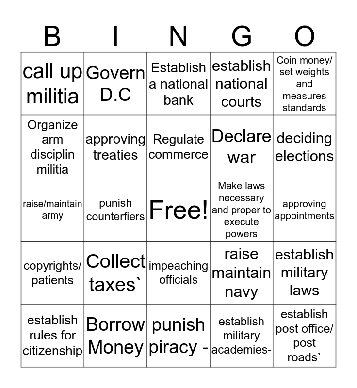 This bingo card has a free space and 24 words: Collect taxes`, Borrow Money, Regulate commerce, establish rules for citizenship, Coin money/ set weights and measures standards, call up militia, Organize arm disciplin militia, Govern D.C, Make laws necessary and proper to execute powers, impeaching officials, Declare war, raise/maintain army, raise maintain navy, establish military laws, approving treaties, establish military academies-, approving appointments, Establish a national bank, deciding elections, punish counterfiers, establish post office/ post roads`, copyrights/ patients, establish national courts and punish piracy -.