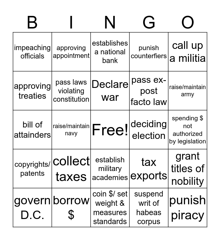 This bingo card has a free space and 24 words: collect taxes, borrow $, Declare war, govern D.C., call up a militia, impeaching officials, approving treaties, approving appointment, deciding election, establish military academies, pass ex-post facto law, bill of attainders, tax exports, grant titles of nobility, pass laws violating constitution, suspend writ of habeas corpus, spending $ not authorized by legislation, establishes a national bank, raise/maintain army, raise/maintain navy, punish piracy, copyrights/ patents, punish counterfiers and coin $/ set weight & measures standards.