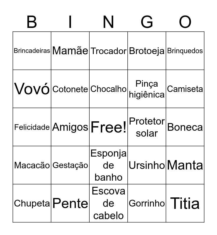 This bingo card has a free space and 97 words: Álbum de fotos, Algodão, Amamentar, Amigos, Amor, Babá eletrônica, Aspirador nasal, Babador, Copo, Banheira, Bebê, Cadeira para carro, Berço, Macacão, Bolsa térmica, Brincadeiras, Brinquedos, Cabide, Poltrona, Culote, Canção de ninar, Canguru, Protetor de carrinho, Casaquinho, Chapeuzinho, Chocalho, Chupeta, Manta, Colônia, Condicionador, Cotonete, Brotoeja, Creme hidratante, Engatinhar, Escova de cabelo, Esponja de banho, Esterelizador, Bomba tira leite, Família, Felicidade, Fraldas, Boneca, Porta mamadeira termico, Gorrinho, Gestação, Grávida, Joelheira, Pula pula, Leite, Lembrancinha, Lenços umidecidos, Lençol, Livro de histórias, Luvas, Body, Madrinha, Mamadeira, Mamãe, Maternidade, Meias, Móbile, Mochila, Mordedor, Mosquiteiro, Nascimento, Pomada, Padrinho, Papai, Papinha, Pente, Pinça higiênica, Porta chupetas, Posicionador para dormir, Pratinho, Prendedor de chupetas, Presentes, Proteção, Protetor de tomadas, Protetor solar, Sabonete, Saboneteira, Camiseta, Shampoo, Talco, Tapete, Termômetro, Titia, Titio, Toalha, Travesseiro, Trocador, Ultrassom, Umidificador, Ursinho, Vovó, Vovô and Colher.