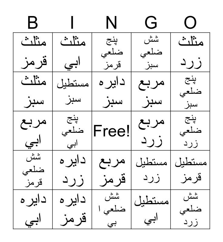 This bingo card has a free space and 24 words: دايره زرد, دايره قرمز, دايره سبز, دايره ابي, مثلث زرد, مثلث قرمز, مثلث سبز, مثلث ابي, مربع زرد, مربع قرمز, مربع سبز, مربع ابي, مستطيل زرد, مستطيل قرمز, مستطيل سبز, مستطيل ابي, پنج ضلعي زرد, پنج ضلعي قرمز, پنج ضلعي سبز, پنج ضلعي ابي, شش ضلعي زرد, شش ضلعي قرمز, شش ضلعي سبز and شش ضلعي ابي.