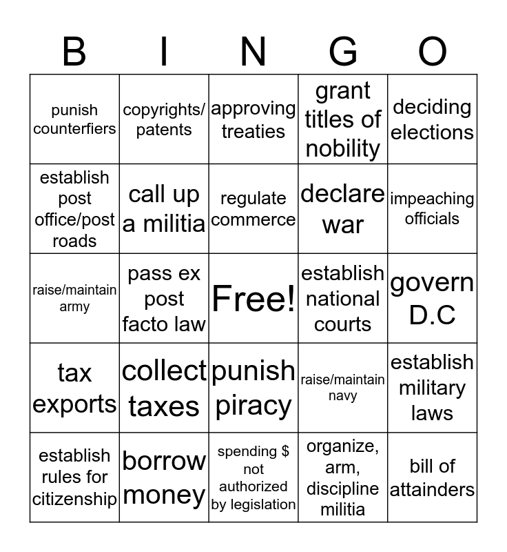 This bingo card has a free space and 24 words: collect taxes, borrow money, regulate commerce, establish rules for citizenship, deciding elections, punish counterfiers, establish post office/post roads, copyrights/ patents, establish national courts, punish piracy, declare war, raise/maintain army, raise/maintain navy, establish military laws, call up a militia, organize, arm, discipline militia, govern D.C, approving treaties, impeaching officials, pass ex post facto law, bill of attainders, tax exports, grant titles of nobility and spending $ not authorized by legislation.
