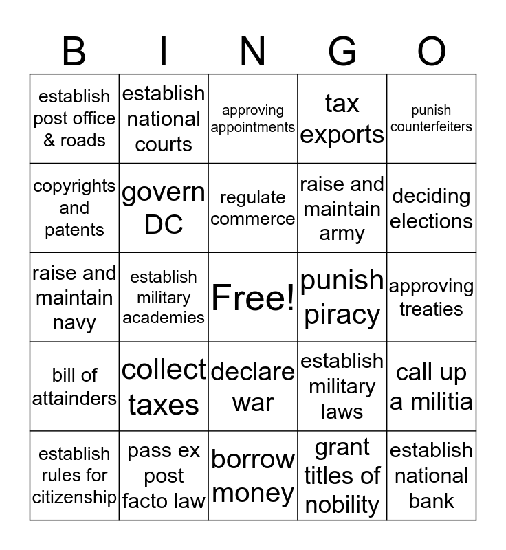 This bingo card has a free space and 25 words: collect taxes, borrow money, regulate commerce, establish rules for citizenship, punish counterfeiters, establish post office & roads, copyrights and patents, establish national courts, punish piracy, declare war, raise and maintain army, raise and maintain navy, establish military laws, call up a militia, govern DC, impeaching officials, approving treaties, approving appointments, deciding elections, establish military academies, establish national bank, pass ex post facto law, bill of attainders, tax exports and grant titles of nobility.